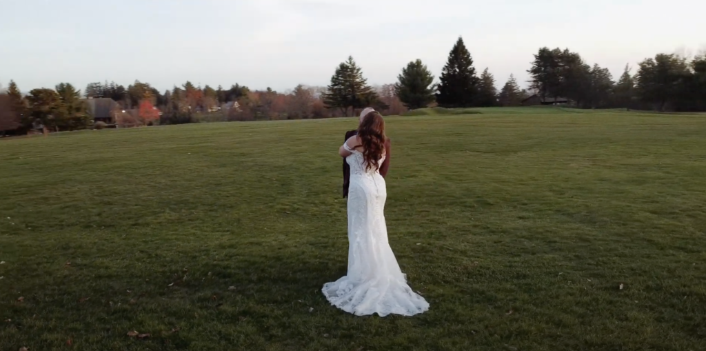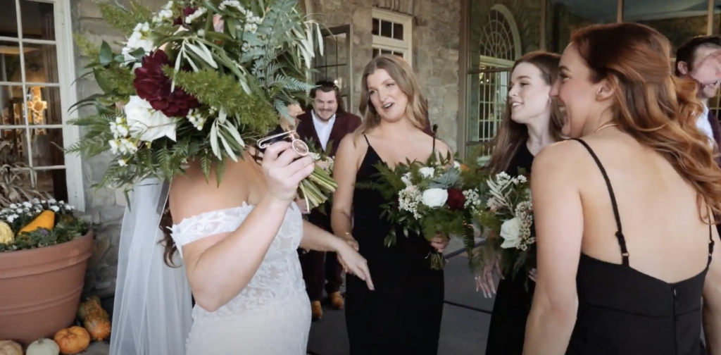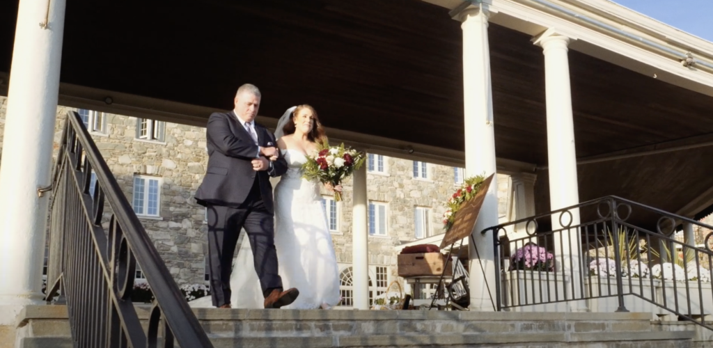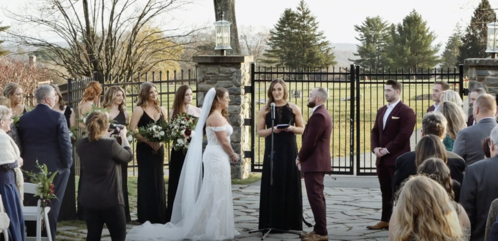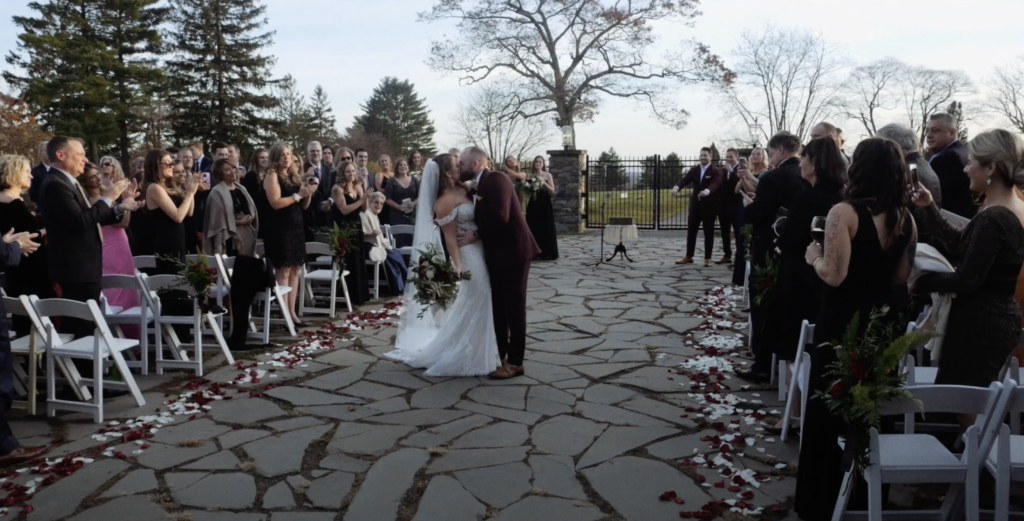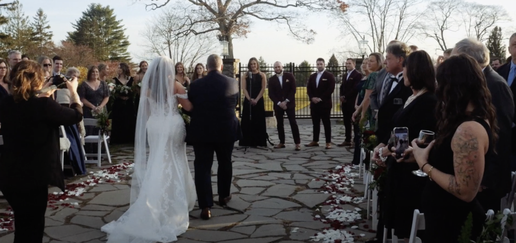 Zoe and Anthony were Married November 4, 2022 at the incredible Skytop Lodge. Skytop Lodge is a beautiful hotel, lodge, golf club in the Pocono Mountains looking over a lake. The stone building almost looks like a stately castle or palace. Zoe and Anthony had a very classy and beautiful wedding. They lucked out with spectacular weather for November in the mountains. It was sunny and warm, but they were ready for much worse with blankets for the guests. The ceremony was held outside in the courtyard of the lodge with a large colonnaded walkway and staircase to walk through. The wedding ceremony was officiated by the groom’s sister, who was also a bridesmaid. She did a beautiful job and was able to make the ceremony very special for the couple. The couple took pictures out on the lawn of the lodge where I got some fun drone shots of the couple. Skycap lodge was a great location for aerial photography because the building provided a striking contrast with the lake, forest, and mountains. I was able to fly over some good distance to get a good video of the property. Shooting at sunset also got some beautiful views of the rolling mountains in the distance. The reception was held in the ballroom where the couple had all the guests come out onto the dance floor after the first dance. There was a lot of dancing for this wedding, the guests did not stay in their seat for long. It was a beautiful and fun wedding, despite the guests being very well dressed and the style/vibe being very classy in general.